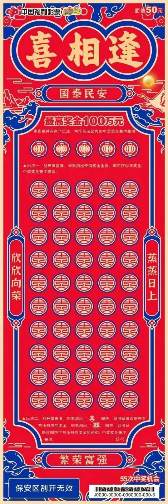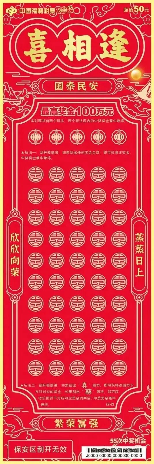 除了精美的喜字纹,票面覆盖膜的四周还印有向上向善的四字成语,如“心想事成”“一帆风顺”“吉祥如意”“万事顺遂”“财运亨通”“鹏程万里”“阖家团圆”“和顺安康”等,希望通过“喜相逢”这样一张小小的彩票,传递美好祝福,展现人们对美好生活的无限憧憬与向往。