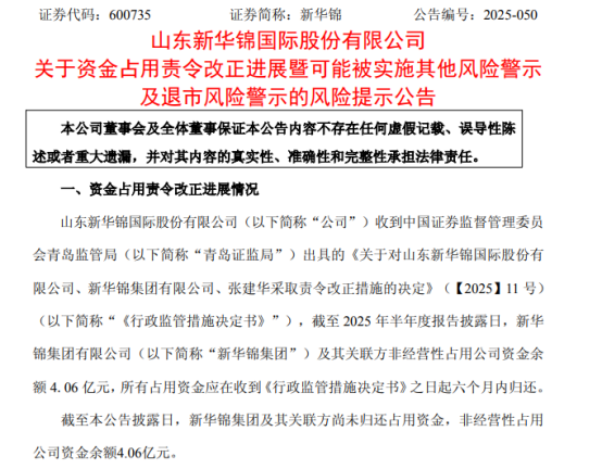 新华锦9月24日发布的公告中披露,公司收到青岛证监局出具的《关于对山东新华锦国际股份有限公司、新华锦集团有限公司、张建华采取责令改正措施的决定》(【2025】11 号),截至 2025 年半年度报告披露日,新华锦集团有限公司及其关联方非经营性占用公司资金余额 4.06 亿元,所有占用资金应在收到《行政监管措施决定书》之日起六个月内归还。截至本公告披露日,新华锦集团及其关联方尚未归还占用资金。