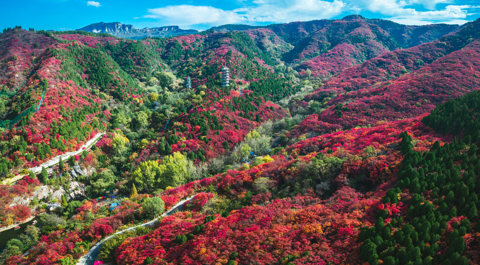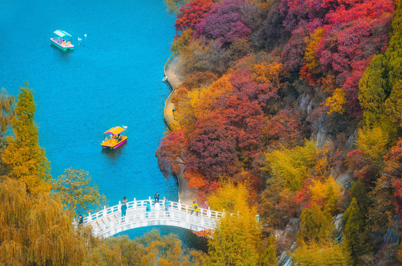 深秋的济南红叶谷,正以一年中最绚烂的姿态拥抱八方游人。近日,漫山红叶进入最佳观赏期,将山谷装扮成童话世界。
