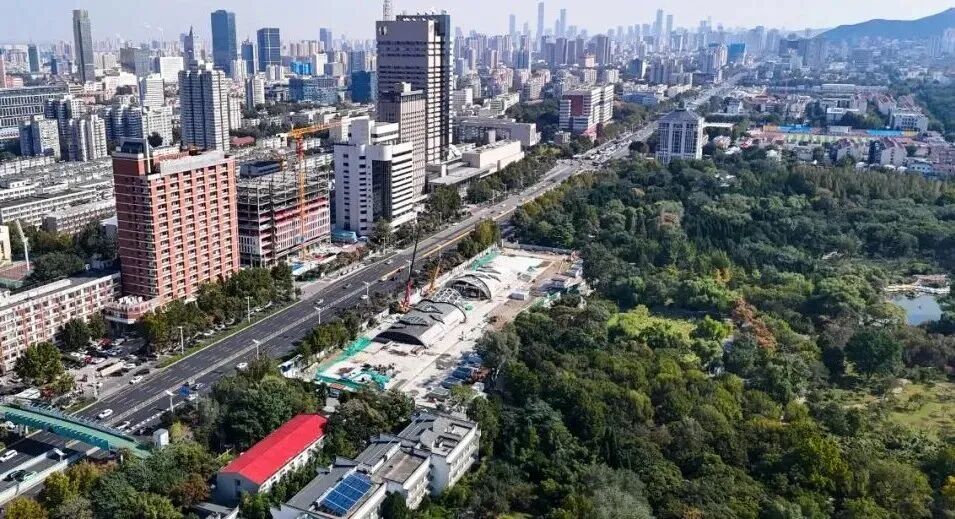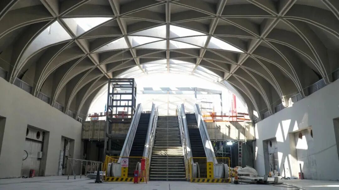 如今,泉城公园站站内装修正稳步推进,双曲薄壳钢筋混凝土与连续拱形的出入口,造型轻盈流畅,线条优美,仿佛是从泉城公园的盎然绿意中“自然生长”而出。这一设计不仅提升了结构效率,更实现了与自然景观的深度融合,让车站本身成为一道靓丽的风景线。