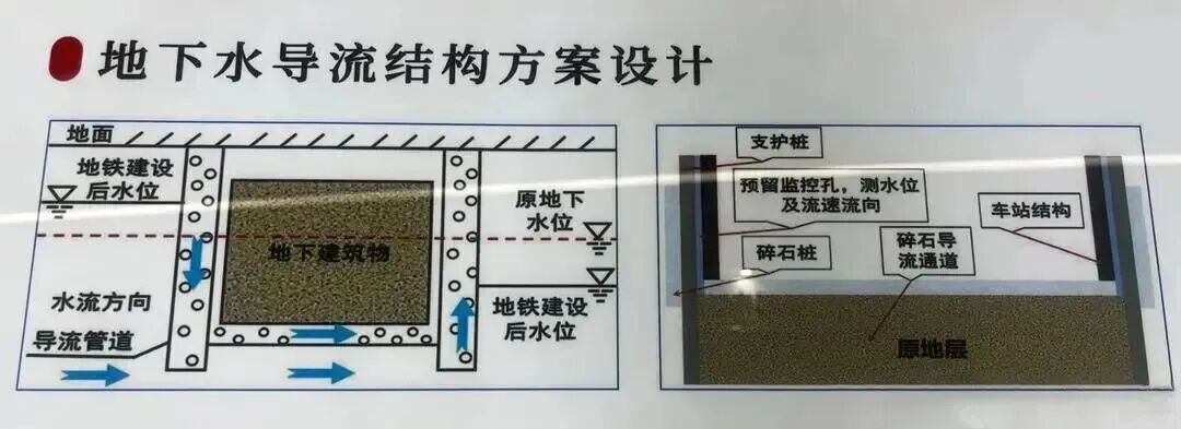 为确保地下水系畅通,建设团队还在车站两侧及基坑底部,精巧设置了一套地下水导流系统。这套系统通过汇水、导水与排水结构的有机结合,如同为地下水搭建起一座临时“立交桥”,保障了施工期间地下水系的自然连通。