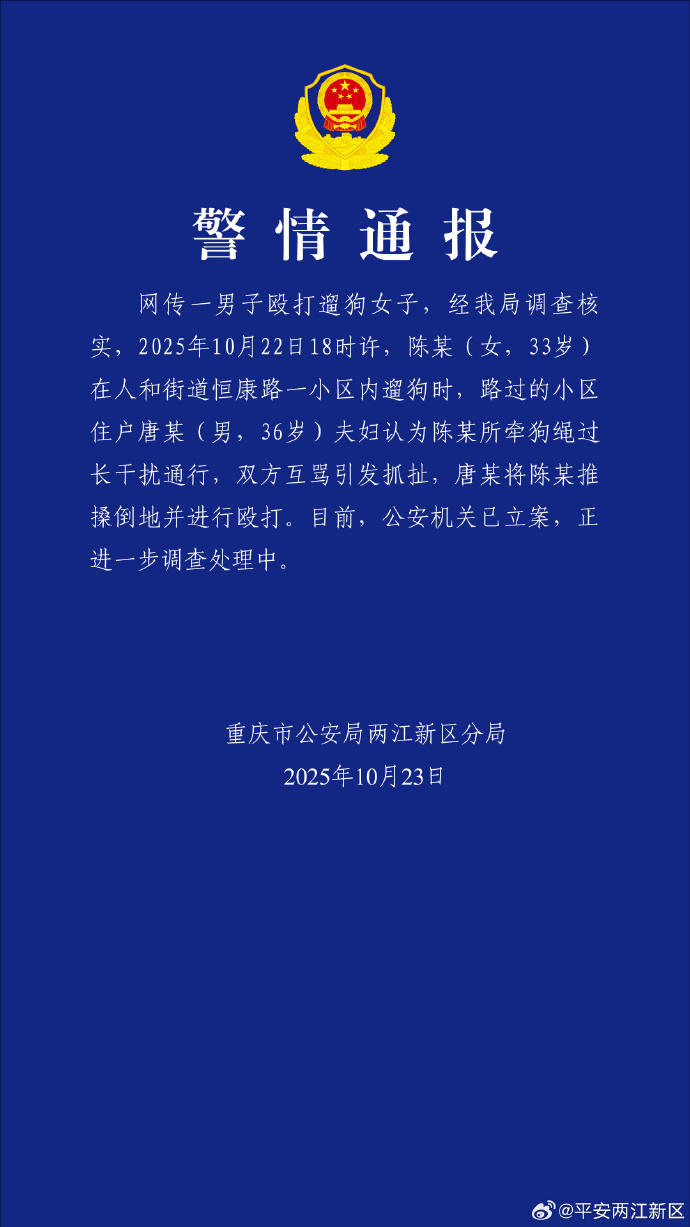 10月23日,重庆市公安局两江新区分局通报,网传一男子殴打遛狗女子,经调查核实,10月22日18时许,陈某(女,33岁)在人和街道恒康路一小区内遛狗时,路过的小区住户唐某(男,36岁)夫妇认为陈某所牵狗绳过长干扰通行,双方互骂引发抓扯,唐某将陈某推搡倒地并进行殴打。目前,公安机关已立案,正进一步调查处理中。