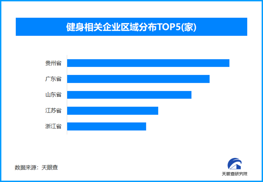 天眼查专业版数据显示,截至目前我国现存在业、存续状态的健身相关企业超163.6万家。从区域分布来看,贵州省、广东省、山东省、江苏省健身相关企业数量位居前列,四个省市数量总和超过59万余家,占企业总数的36.07%。