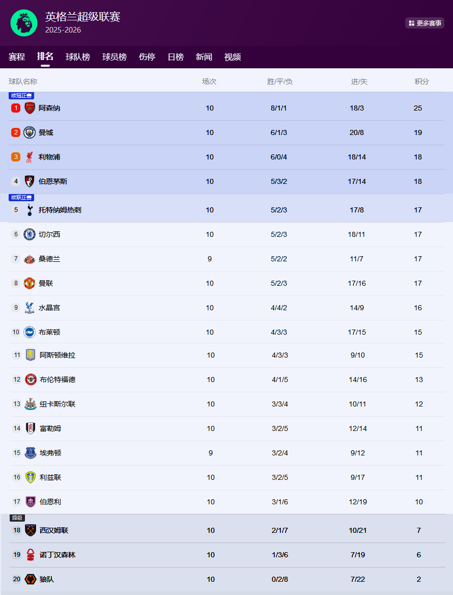 自从首轮2-4不敌利物浦后,伯恩茅斯已经连续8轮不败(5胜3平),最终曼城送给伯恩茅斯近9轮首败。此役获胜后,曼城10轮积19分升至第二位,距离榜首的阿森纳6分。积18分的伯恩茅斯,则降至第四位。