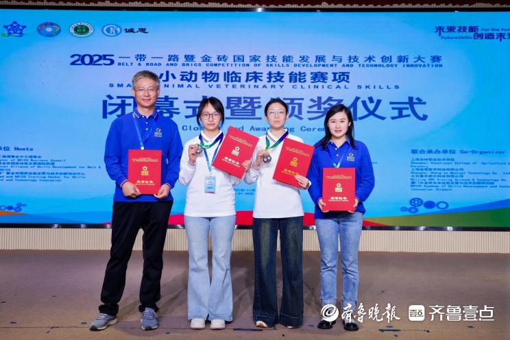10月31日至11月3日,2025一带一路暨金砖国家技能发展与技术创新大赛首届小动物临床技能赛项在上海农林职业技术学院举办。由农学系教师李成元、郝佳佳指导的侯雨晴、许晓涵两位同学组成的参赛队伍脱颖而出,斩获银奖(二等奖),教师获“优秀指导老师”称号。
