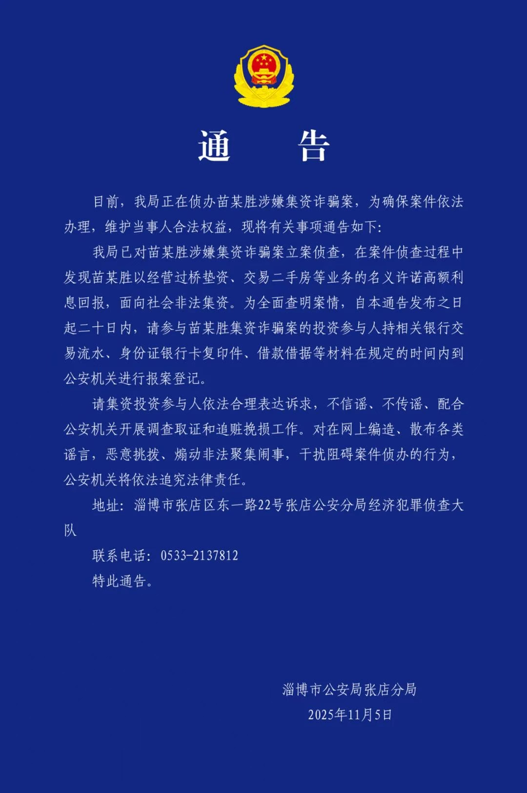 近日,淄博市公安局张店分局发布关于侦办苗某胜涉嫌集资诈骗案有关事项的通告,具体内容如下。