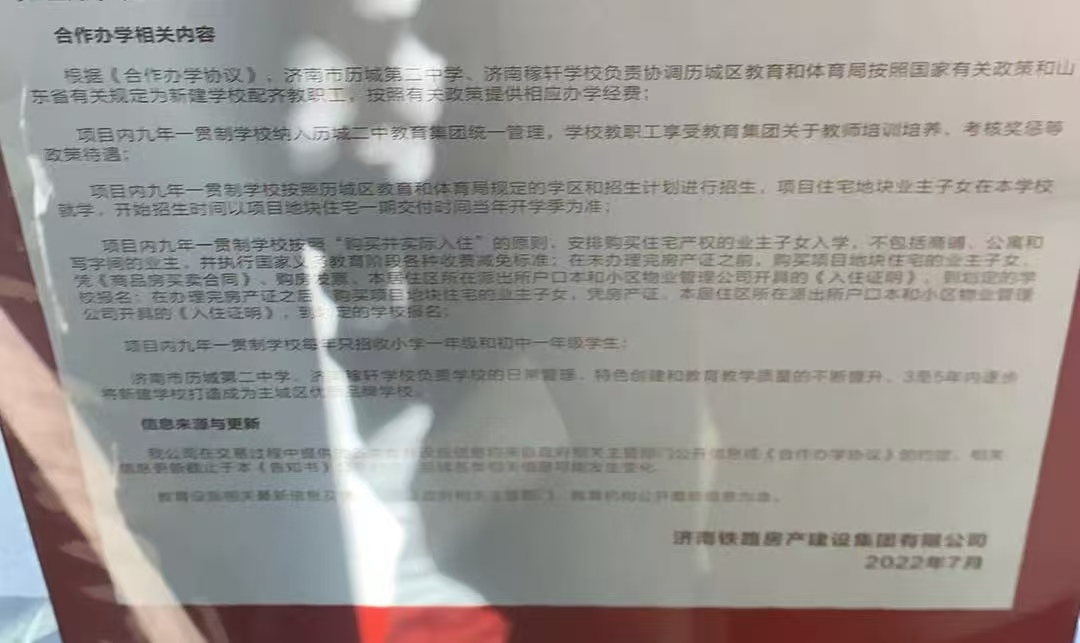 据郭先生介绍,当初选择在此购房,核心考量是楼盘开售时释放的教育配套信息。彼时对外宣传“幼小初12年一站式服务”,并与历城二中教育集团、稼轩中学达成合作办学协议,小区配建学校可实现“家门口上学”。