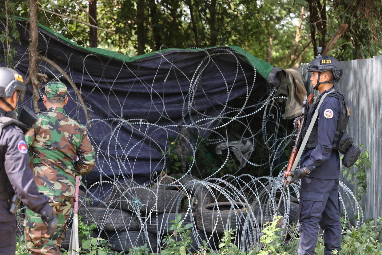 8月14日,在柬埔寨班迭棉吉省一个边境村庄,柬埔寨武装人员在铁丝网和轮胎旁执勤。新华社/柬新社