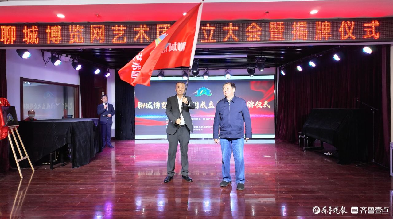 随后,进入大会最庄严的揭牌与授旗仪式环节。聊城市政协原党组副书记、副主席,市文化和旅游行业党委书记王广柱与聊城市政协原副主席,市老体协副主席张广霞为“聊城博览网艺术团”揭牌,王广柱向艺术团授予团旗并宣布艺术团成立,张广霞向徐雪峰颁发聊城博览网艺术团团长聘书。
