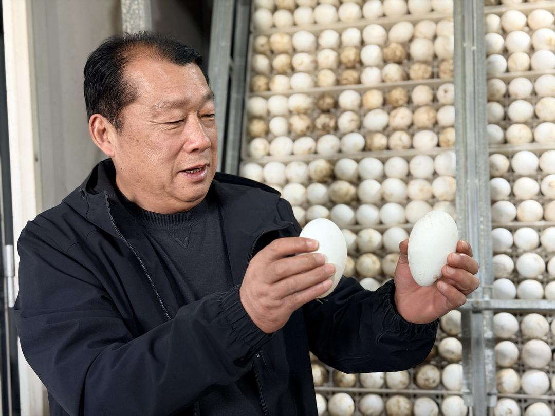 为突破技术瓶颈,在李阁镇的帮扶下,刘宝猛联合山东农业大学、青岛农业大学组建攻关团队,针对种质退化难题对症开方;更在专家指导下钻研出反季节繁育技术,通过光照、温度、饲料的精准调控,让种鹅在夏季也能稳定产蛋,年孵化量从50万只飙升至220万只。