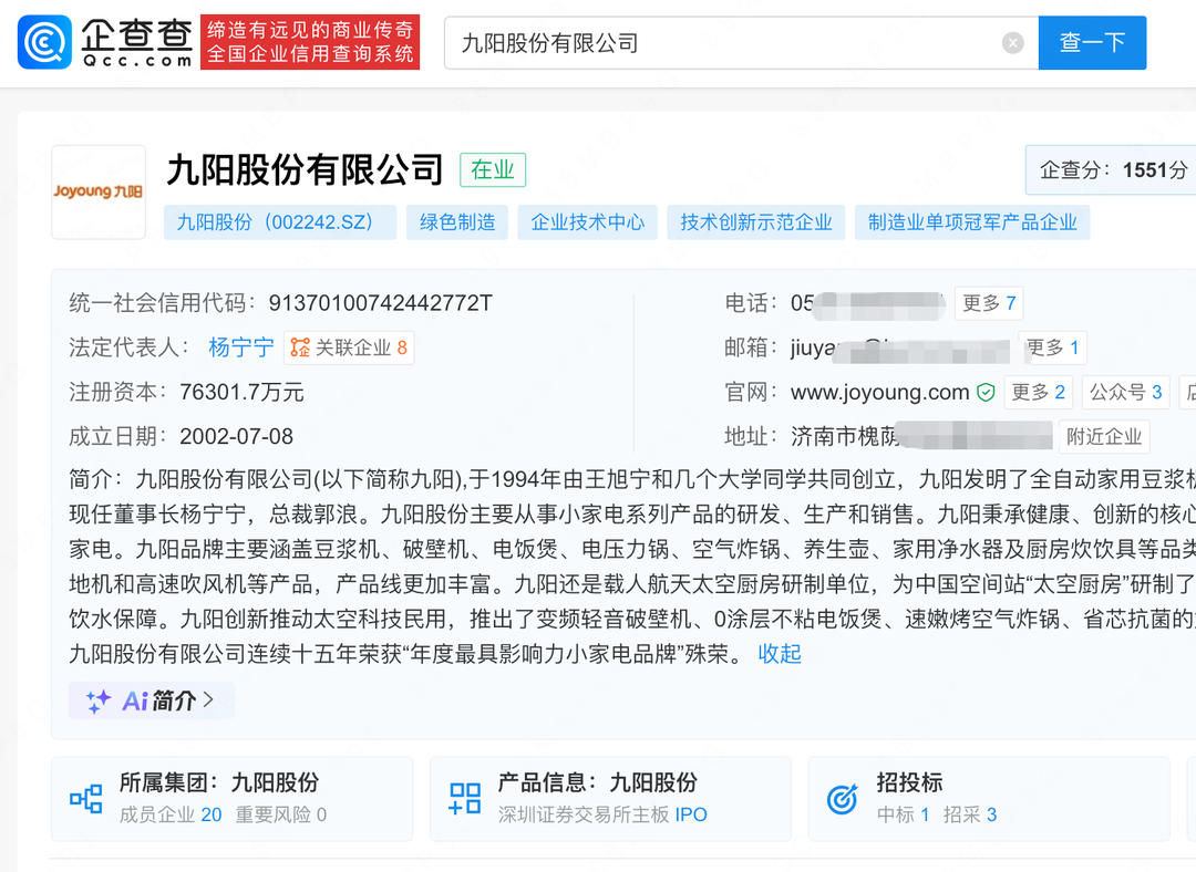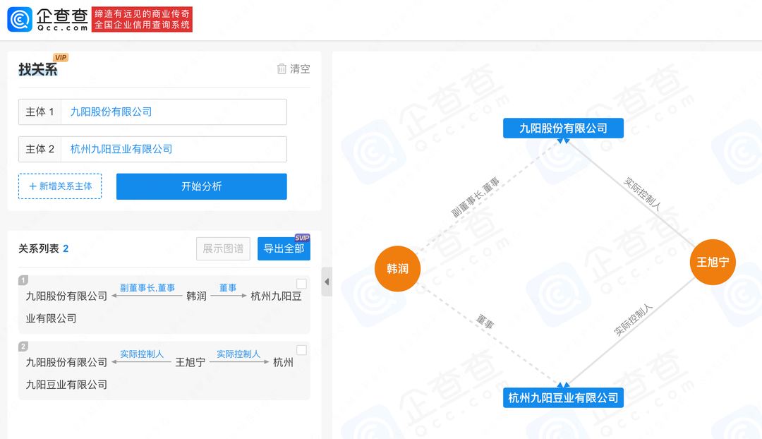 据企查查信息显示,九阳股份有限公司成立于2002年7月,注册资本7.6亿,杨宁宁担任法定代表人、董事长等。此外,杭州九阳豆业有限公司成立于2008年11月,蔡秀军担任法定代表人、董事长。值得注意的是,当前两公司并未存在股权关联,九阳股份于2023年已退出股东行列。根据股权穿透显示,王旭宁担任九阳股份有限公司、杭州九阳豆业有限公司的实控人,韩润担任九阳股份有限公司副董事长、杭州九阳豆业有限公司董事。