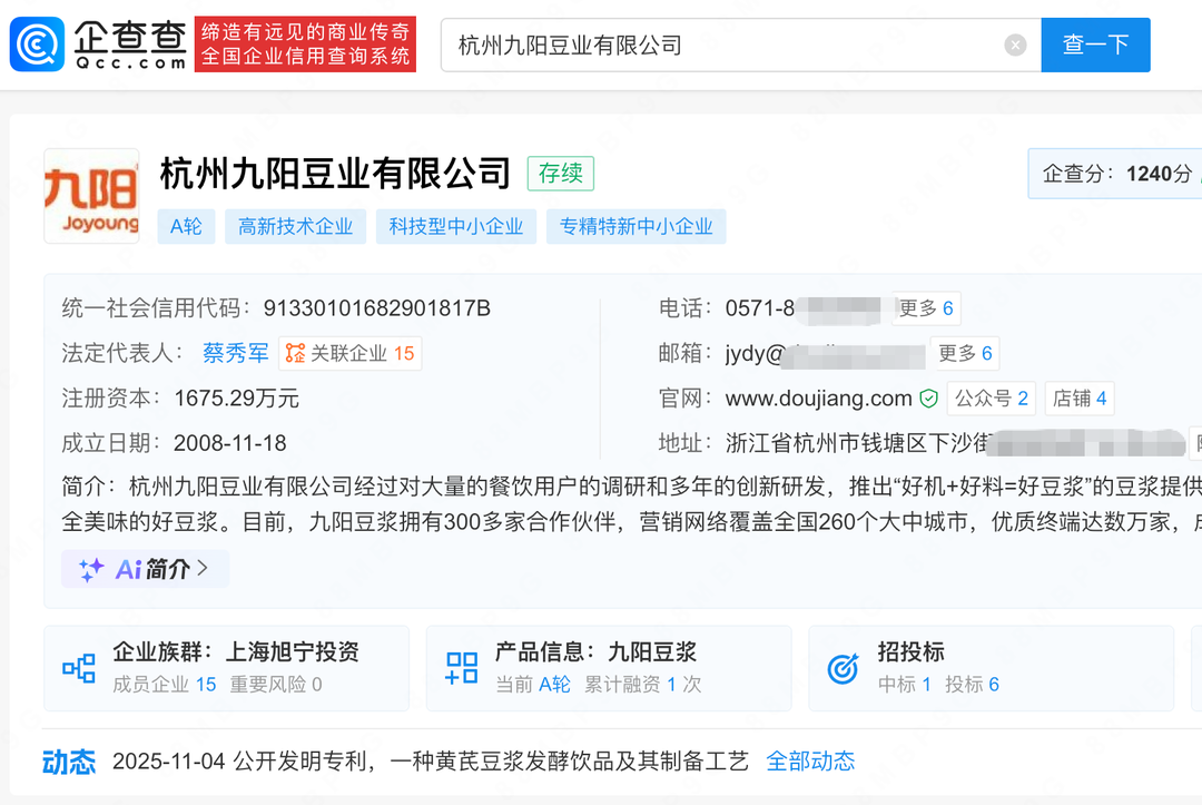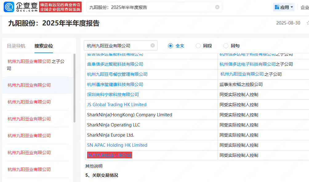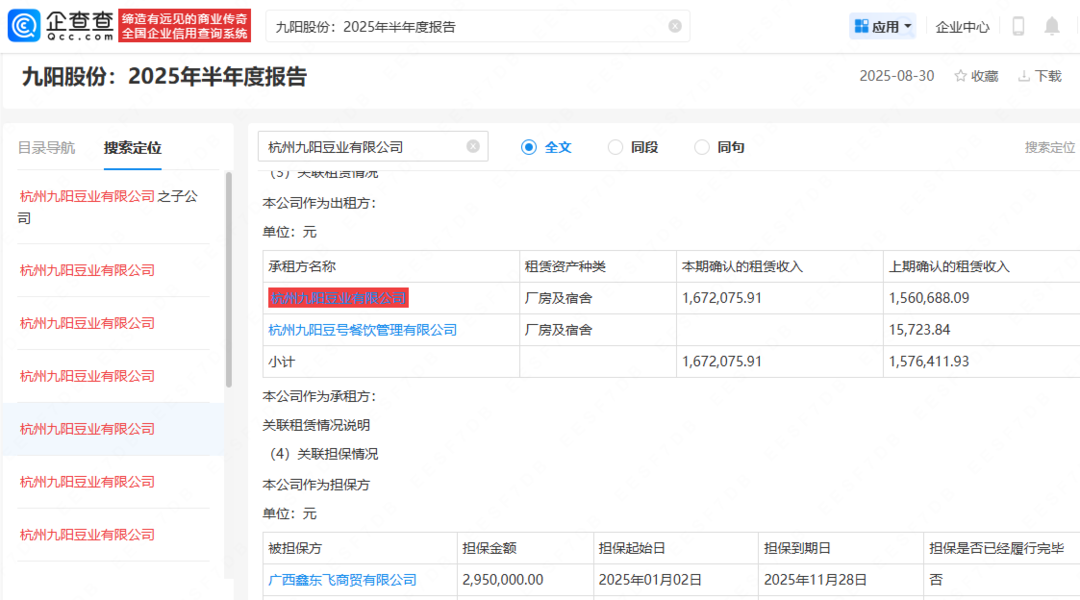 此外,据九阳股份2025年半年度报告披露,杭州九阳豆业属同受实际控制人控制。同时,九阳股份通过出租厂房及宿舍给九阳豆业取得收入167万。