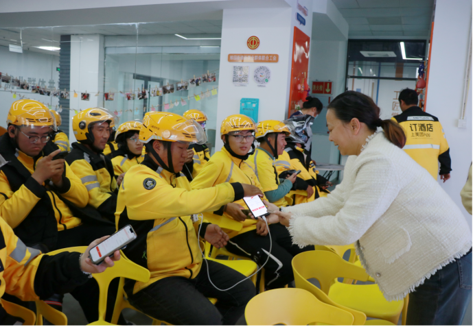 活动现场,工会干部没有照本宣科,而是走到骑手中间,用最通俗的大白话,拆解着“加入工会有什么用”。