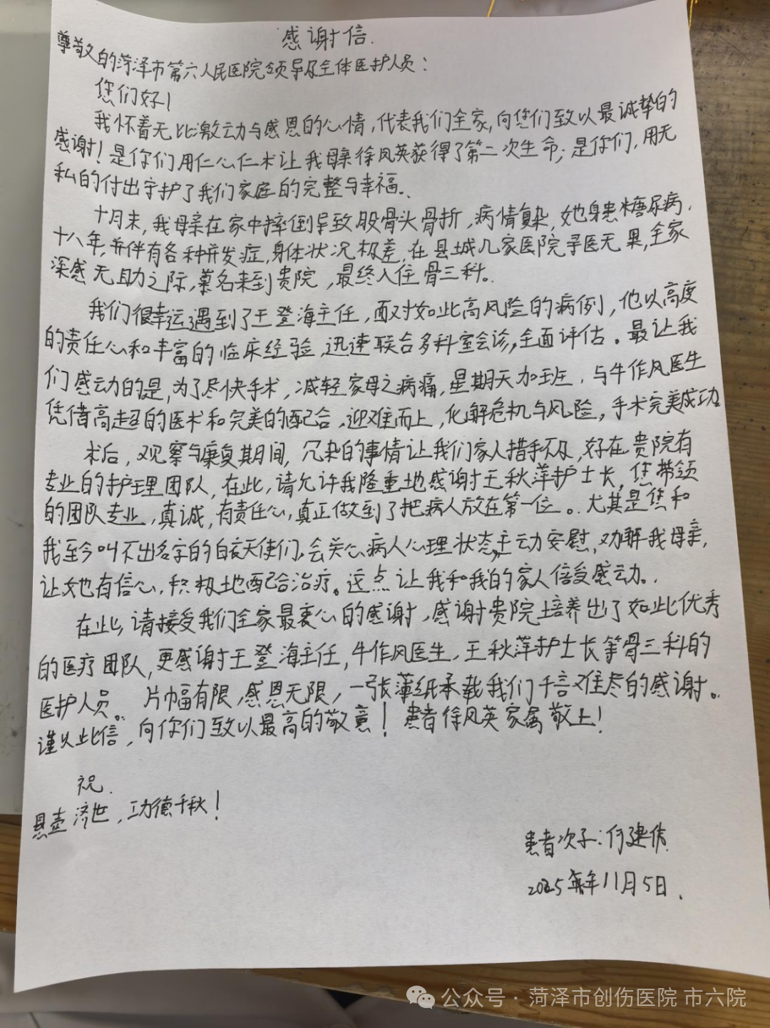 当术后第一天,徐女士在医护人员的搀扶下成功下床行走时,儿子红着眼眶哽咽道:“是他们用仁心仁术,给了我母亲第二次生命!”家属在手写感谢信中写道:“从绝望到希望,是菏泽市创伤医院(市六院)骨三科的医护们不放弃、不退缩,用专业和爱心拯救了我们全家。”