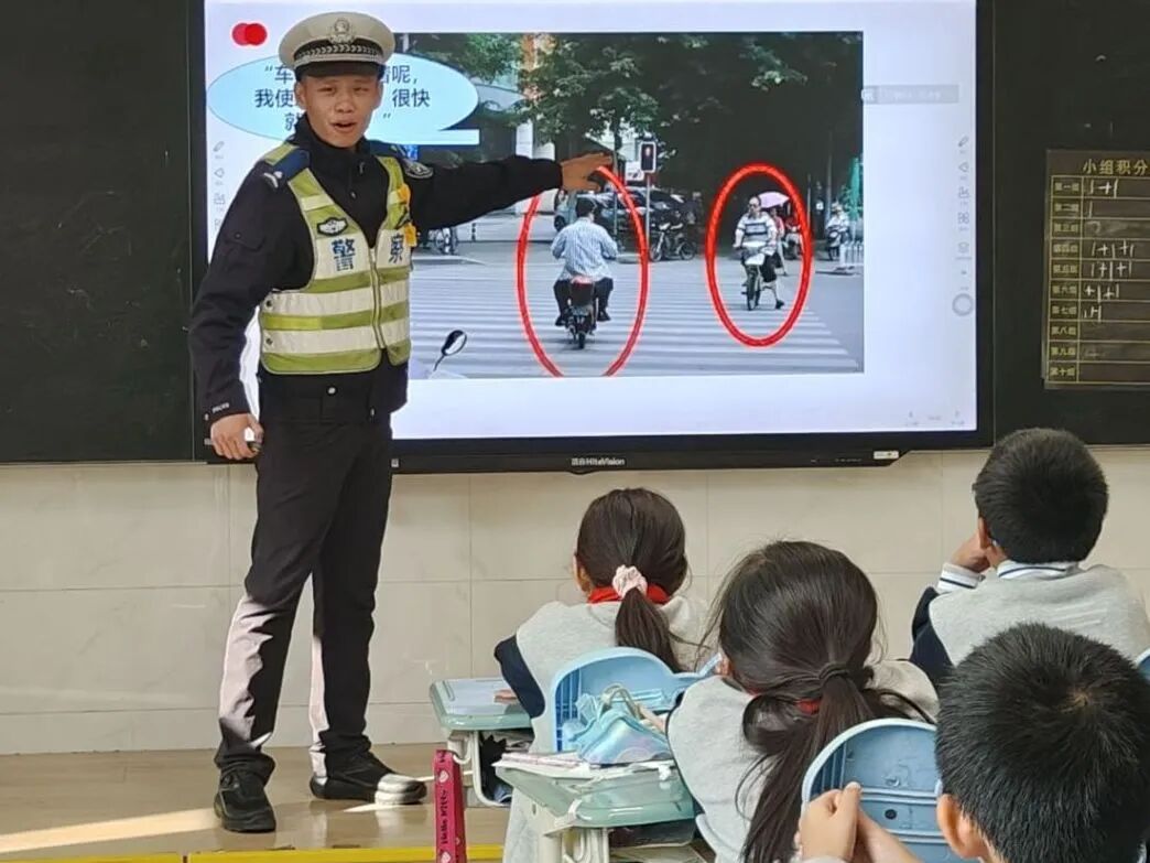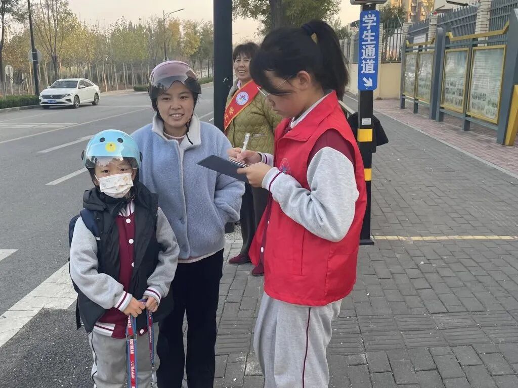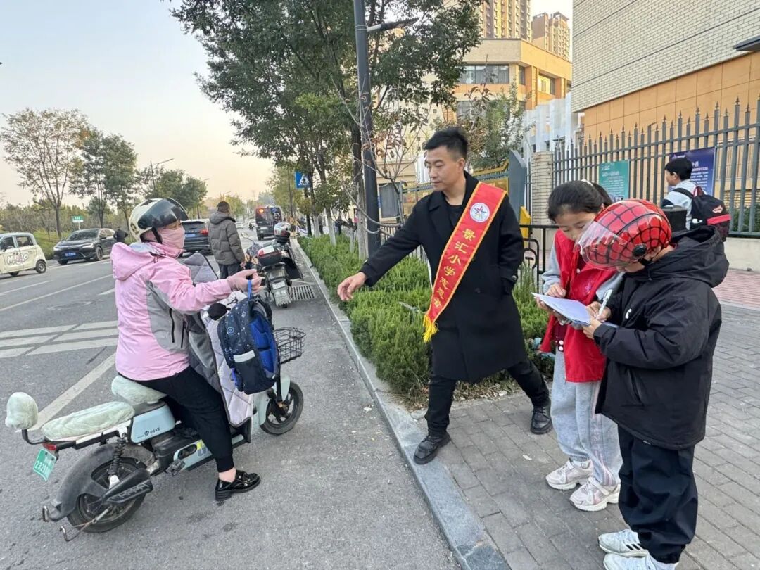 此外,学校少先大队委成员化身“小小安检员”,每天在学生入学通道认真检查同学们的头盔佩戴情况,对规范践行 “一盔一带”的同学及时给予口头表彰和小贴纸奖励,用榜样的力量带动更多同学养成文明出行好习惯。