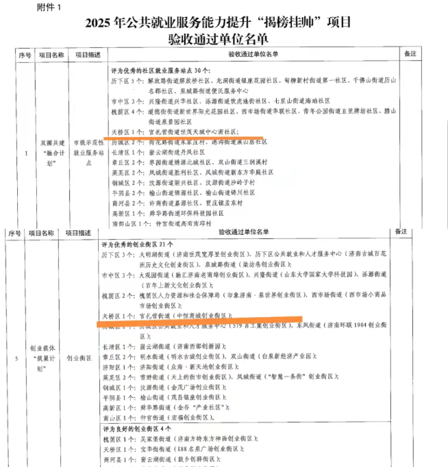 近日,济南市公共就业服务中心印发《关于对公共就业服务能力提升“揭榜挂帅”项目验收结果进行公示的通知》,官扎营街道喜获双重荣誉:世茂天城中心南社区获评市级优秀示范性社区就业服务站点,中恒商城创业街区获评市级优秀创业街区,均为天桥区唯一入选的优秀项目,街道公共就业服务改革创新成效显著。