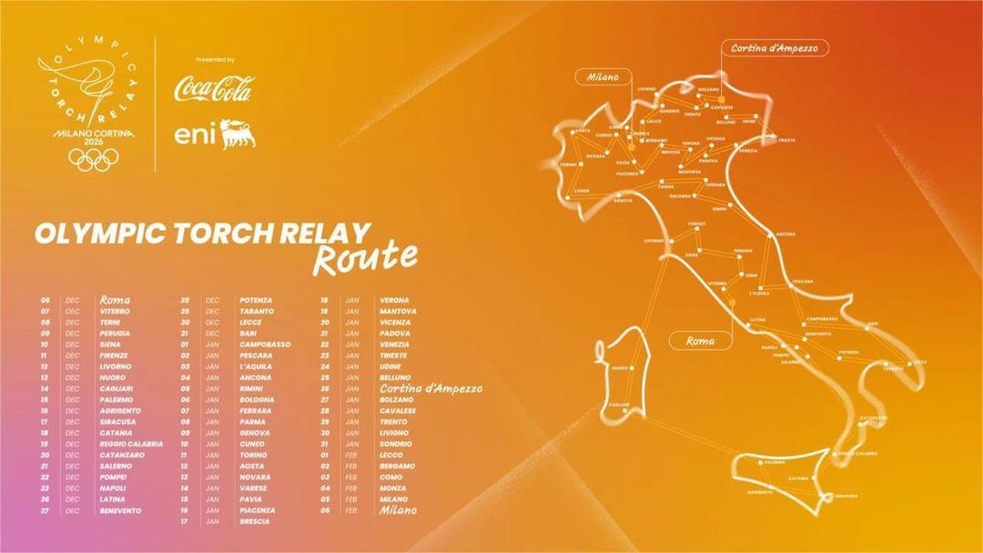11月26日,奥运圣火将在希腊奥林匹亚古奥运遗址点燃。随后,圣火将在希腊境内进行传统仪式性传递,并于12月4日在雅典的交接仪式上正式移交给意大利代表团。随后圣火将在12月6日从首都罗马正式出发,开启在意大利境内的传递。
