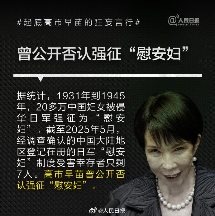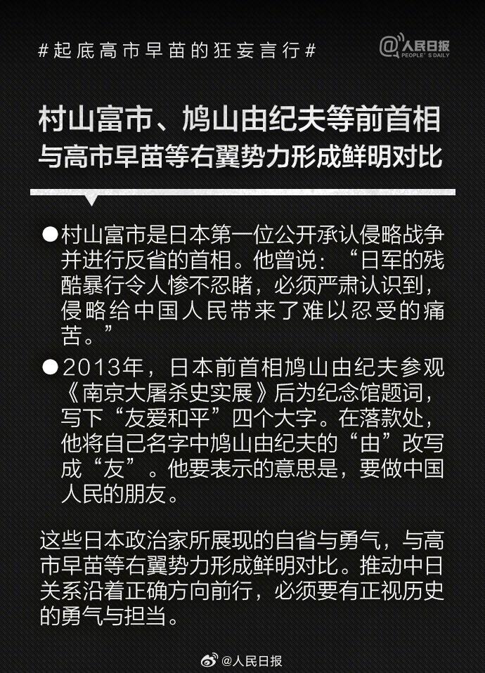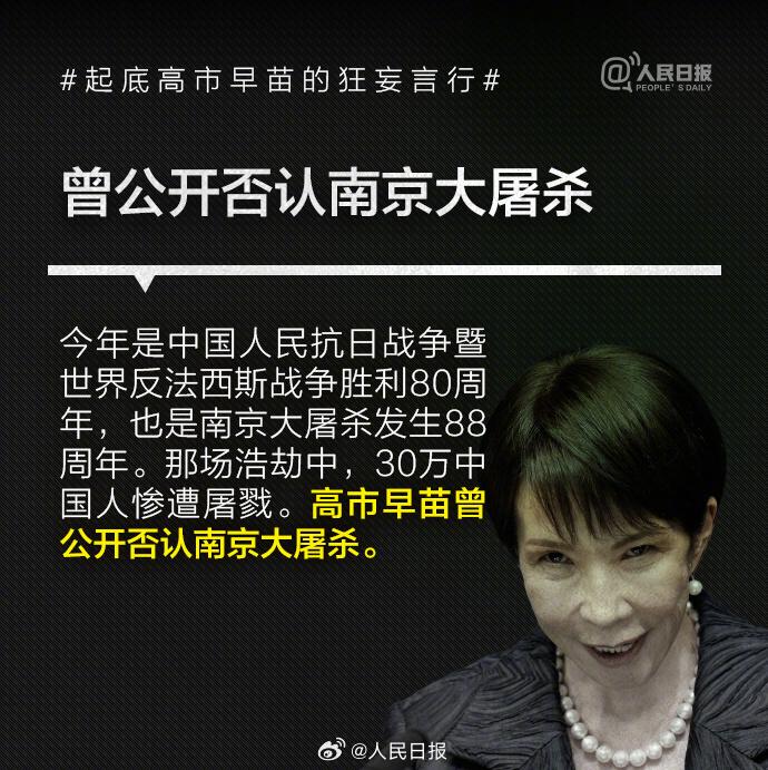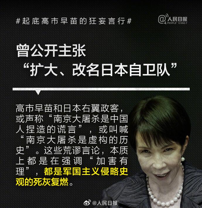 1993年高市早苗当选日本国会议员后,公开主张修改日本和平宪法、扩大和改名日本自卫队、参拜靖国神社,其言行与许多臭名昭著的日本右翼政客如出一辙。高市2014年来参拜靖国神社超10次。历史的教训岂敢忘却!我们绝不允许日本军国主义复活,破坏世界和平稳定。 (人民日报微博)