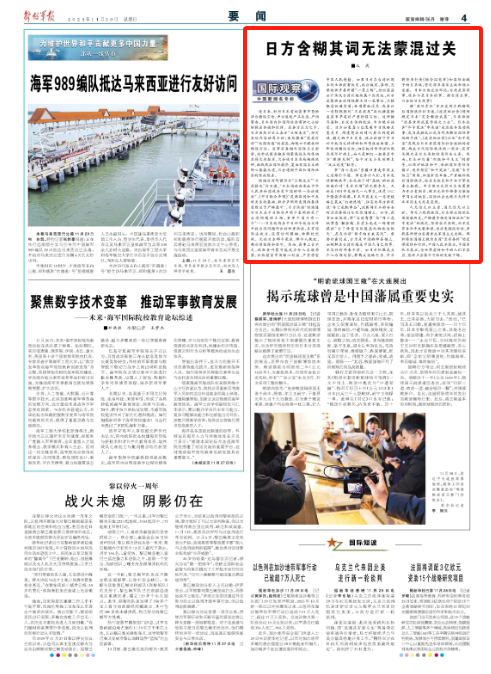 11月30日,《解放军报》第04版发表文章《日方含糊其词无法蒙混过关》。