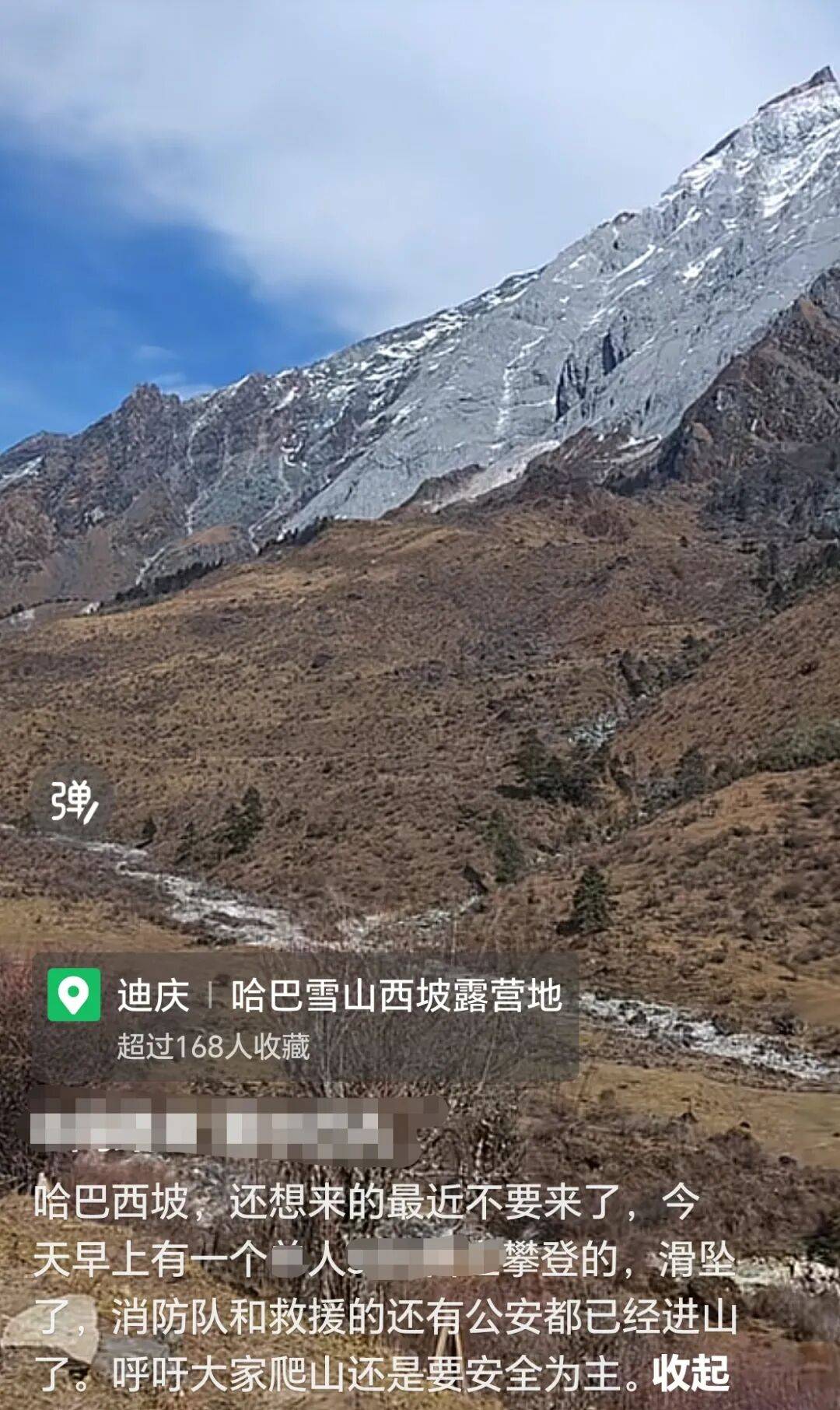 12月2日,网友发布视频称,有人在云南哈巴雪山登山时滑坠,救援队已在搜寻。