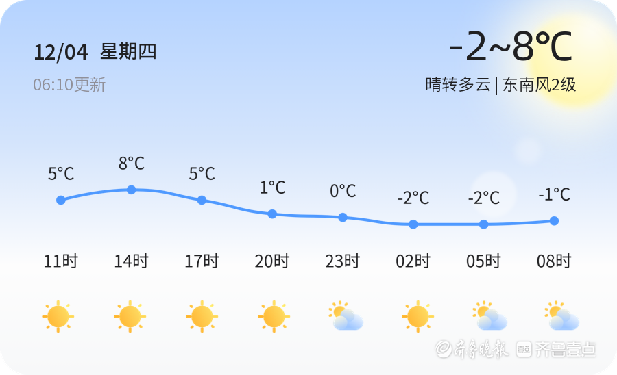 今天是12月4日,星期四,农历十月十五。菏泽市迎来晴转多云的天气,气温在-2℃至8℃之间。全市各区天气情况相似,风力较小,东南风2级,空气湿度为64%,PM2.5指数为79,空气质量良好。当前温度为-0.7℃,天气晴朗,适合户外活动。