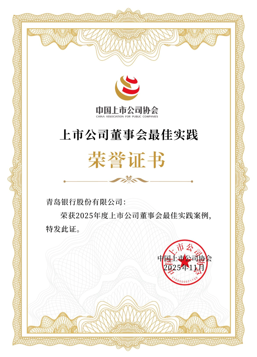 再度折桂“2025年度上市公司董事会最佳实践”奖项,既是对青岛银行董事会运作与公司治理水平的权威认证,更是对青岛银行长期深耕治理实践的高度赞誉。青岛银行将以此为新起点,持续深化公司治理体系、精进治理专业能力与实践质效,通过卓越治理为当前战略规划的完美收官以及新三年战略规划的良好开局贡献力量!
