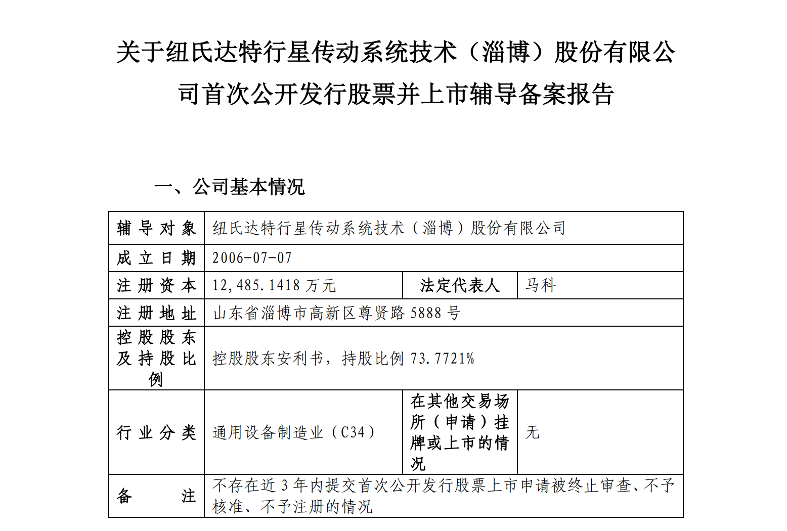 根据证监会官网最新披露的最新消息,纽氏达特行星传动系统技术(淄博)股份有限公司(下称:纽氏达特)已向山东证监局提交上市辅导备案,备案日期为12月2日,辅导机构为东方证券。