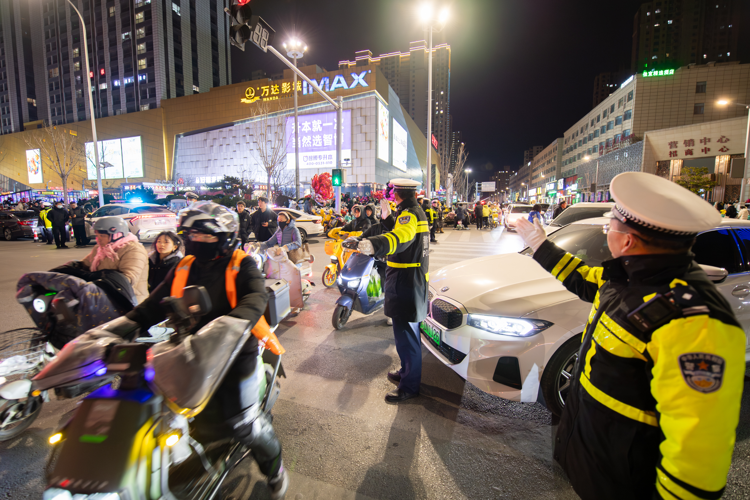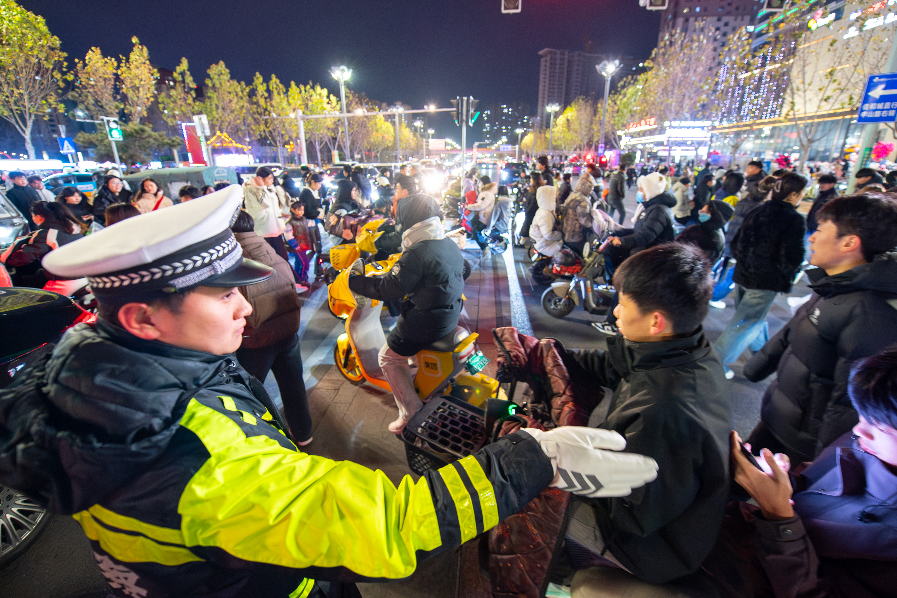 跨年夜,菏泽佳和、万达商圈成了 “人气磁场”:街头挤满逛游人群,粉色气球堆成浪漫 “小山”,车流、人流交织成跨年 “热力图”。为应对拥堵,菏泽交警提前增派警力,在商圈周边路口 “扎点” 执勤 —— 荧光黄警服穿梭在人潮里,指挥车辆分流、引导行人有序通行,连外卖小哥的电动车都被疏解得 “不卡壳”。