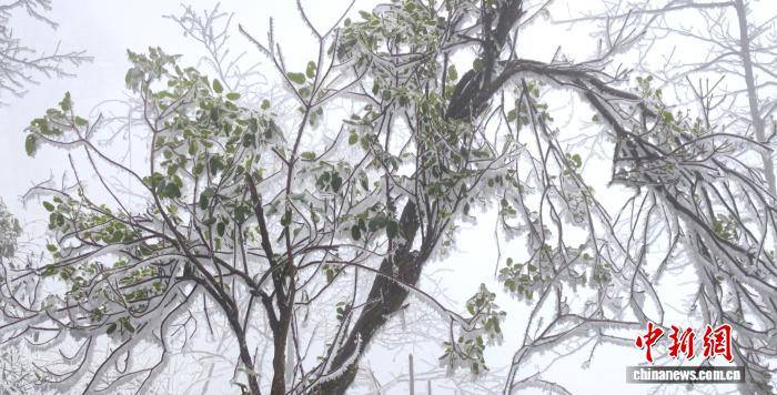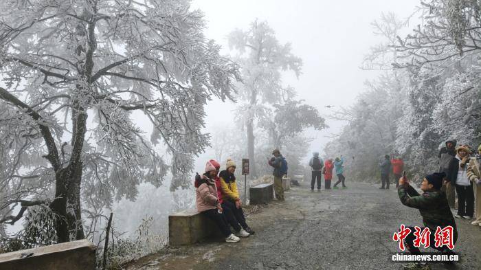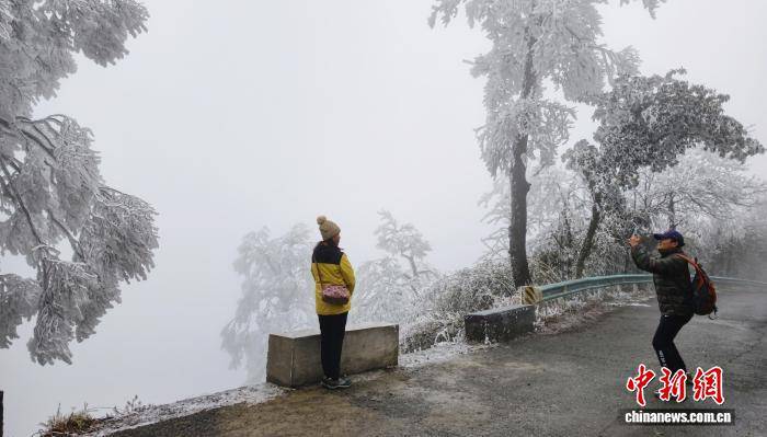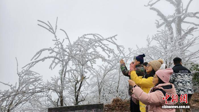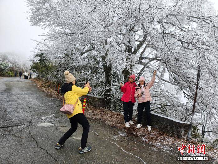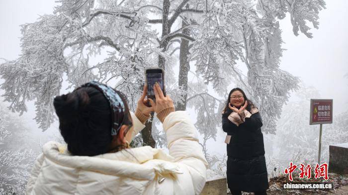 连日来,受强冷空气影响,广西桂林市兴安县猫儿山迎来雾凇最佳观赏期。这座海拔2141.5米的“华南第一峰”银装素裹,玉树琼枝的绝美景致吸引游客慕名前来,邂逅南国独有的冰雪浪漫。图为游客在猫儿山雾凇前拍摄。滕彬 摄