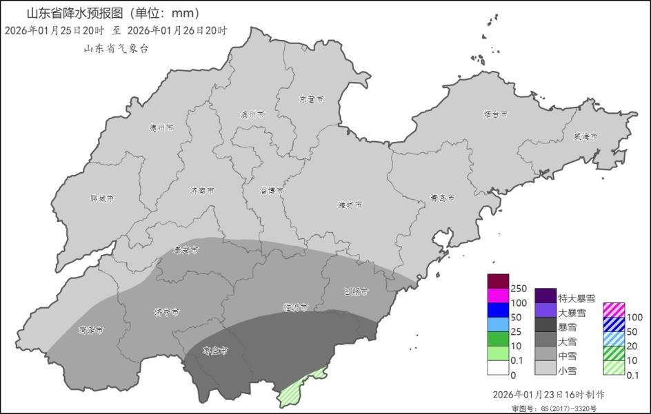 1月23日16时,山东省气象台发布雨雪预报:受冷空气和暖湿气流共同影响,预计25日夜间到26日白天,山东自西向东将有一次较明显雨雪天气过程,全省累积平均降水量1~3 毫米(图1)。其中,菏泽、济宁、枣庄、临沂、日照和泰安有雨夹雪转小到中雪局部大雪(2~6 毫米),聊城、德州、济南、淄博、潍坊和青岛有小雪局部中雪(0.1~3 毫米 ),滨州、东营、烟台和威海局部有小雪(0~1 毫米)。