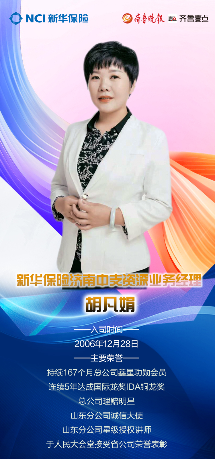 “助人助己做保险,成人达己结善缘。”新华保险济南中支资深业务经理胡凡娟,自2006年12月入司以来一直本着这个信念展业,这也是她从业十九年一直坚持的工作原则。从个体经营者到现在连续5年达成IDA国际铜龙奖,且拥有自己团队的资深业务经理,胡凡娟一直在以更高的标准要求自己。以客户为中心的真诚服务所收获的感激和情谊,也让胡凡娟不断加深自我的使命感,想要在保险行业一步一步创造属于自己的辉煌。