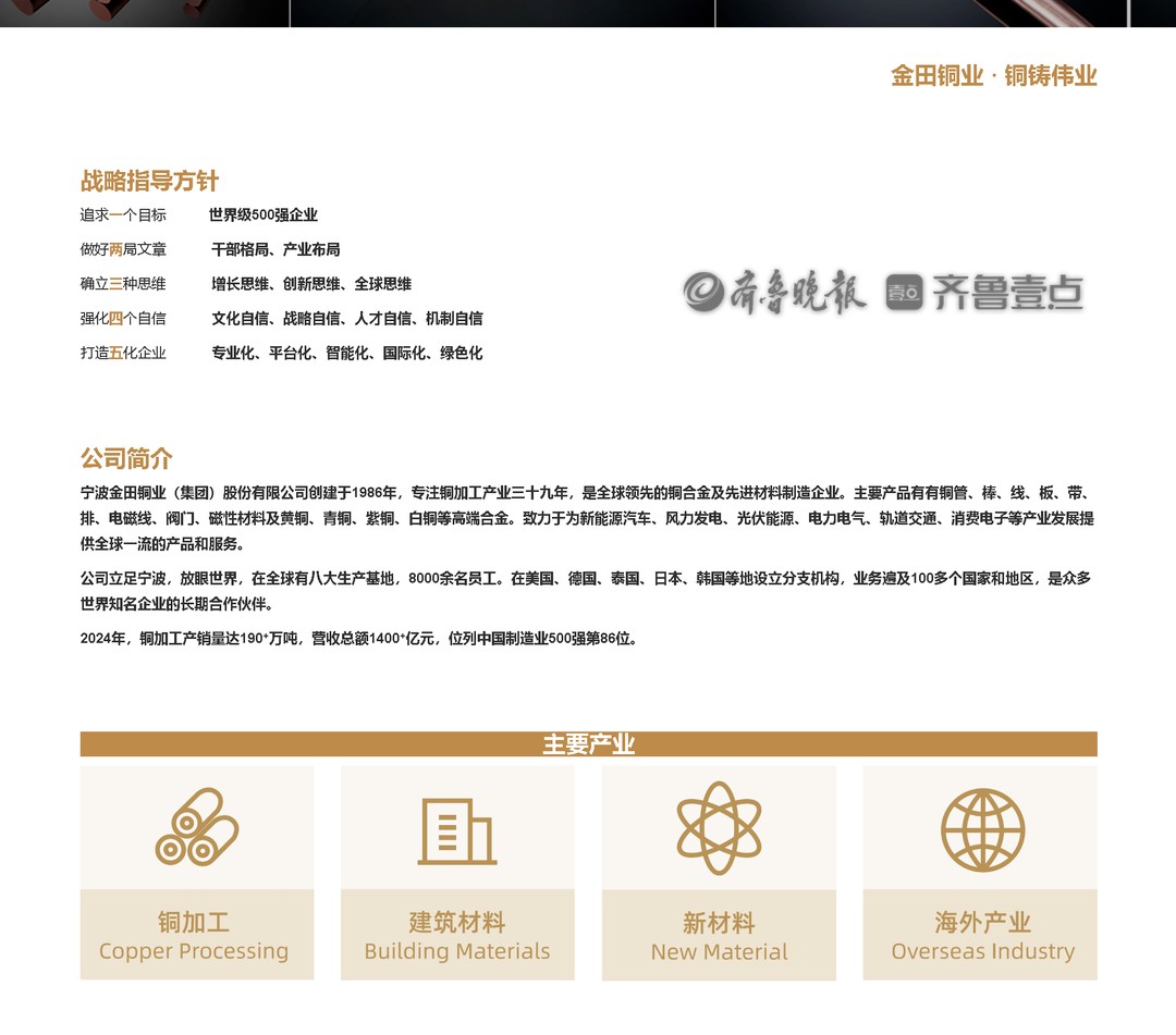 2024年,铜加工产销量达190⁺万吨,营收总额1400⁺亿元,位列中国制造业500强第86位。