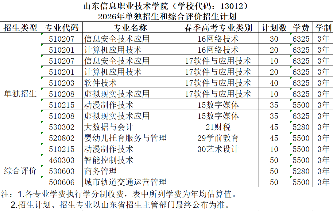 山东信息职业技术学院2026年单独招生和综合评价招生计划来了,2026年学校安排单独招生(普通类)计划300人,综合评价招生计划150人,学校代码为13012。