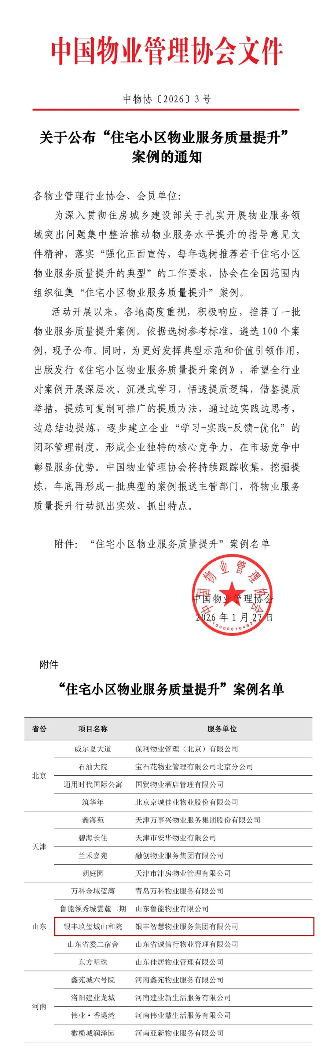近日,中国物业管理协会印发通知,正式公布“住宅小区物业服务质量提升”典型案例名单,其中由银丰智慧物业服务有限公司管理服务的银丰玖玺城山和院小区项目成功入选,体现了银丰物业在服务提质增效方面的积极探索和扎实成效,也为物业行业高质量发展树立了可学习、可推广的实践标杆。