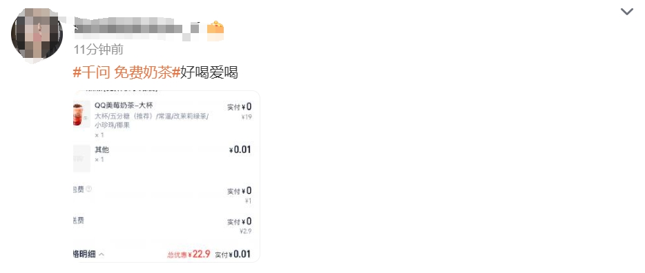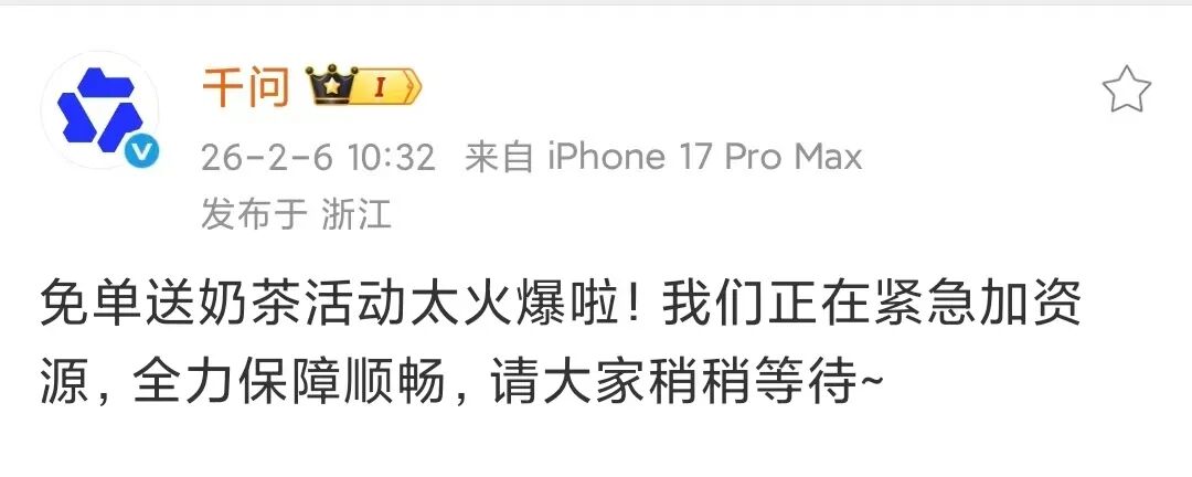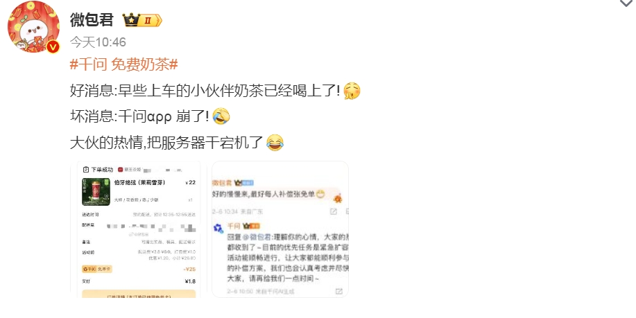 不过,有用户发现,在参与奶茶免单时,页面无法点击,信息显示“系统开小差了,稍后再试吧”,虽然最后成功下单,但过程并不丝滑。对此,千问APP在官方微博账号上回应:“免单送奶茶活动太火爆啦,我们正在紧急加资源,全力保障顺畅,请大家稍稍等待。”