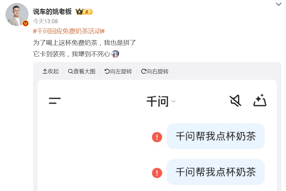 博主“说车的姚老板”:为了喝上这杯免费奶茶,我也是拼了,它卡到装死,我犟到不死心。
