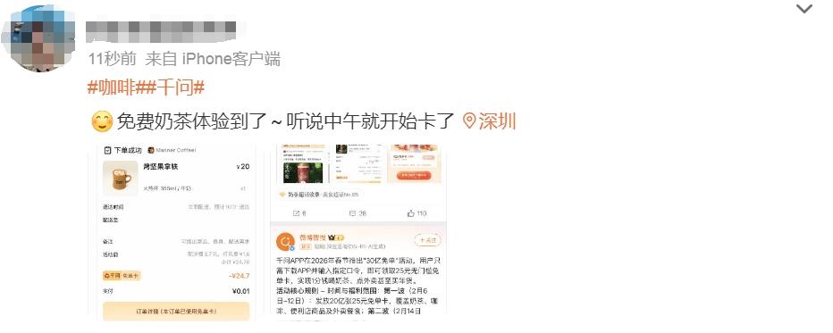 2月6日,阿里千问APP“春节30亿大免单”正式上线,发起奶茶攻势,请全国人民用AI一句话免费点奶茶。此次千问30亿元春节请客计划,在阿里历史上的春节活动中投入最大,在今年春节大厂AI大战中投入金额也最高。