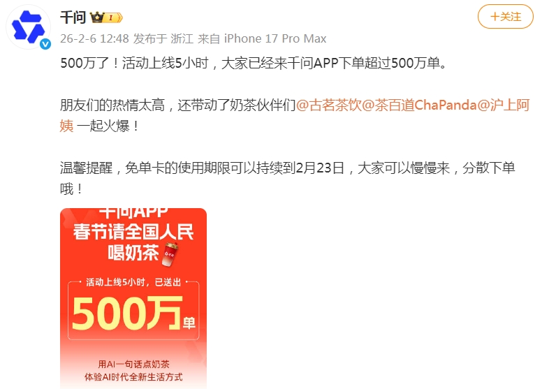 据千问消息,活动上线5小时,用千问APP下单超500万单,并提醒大家,免单卡的使用期限可以持续到2月23日,大家可以慢慢来,分散下单。