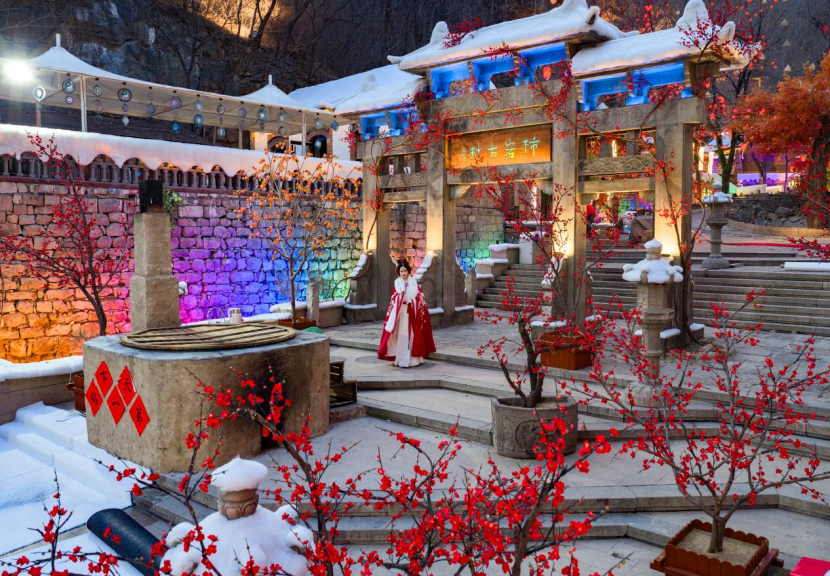 红叶柿岩精心策划,构建了“日间寻梅、夜间赏艺”的全时段体验格局。日间活动以“寻梅三境”为核心主题场景,雪映红墙、梅影婆娑的中式园林景致,将诗意与画意完美融合,让游客漫步其间,沉浸式感受中式冬日的独特韵味与诗情画意。同时,景区还将推出“百戏杂艺”街头表演,《顶缸》《转碟》《三仙归洞》等经典传统杂耍戏法将在游园动线中定时呈现,以分散式互动表演复刻记忆中的热闹年味,为游客的游园之旅增添趣味与惊喜。