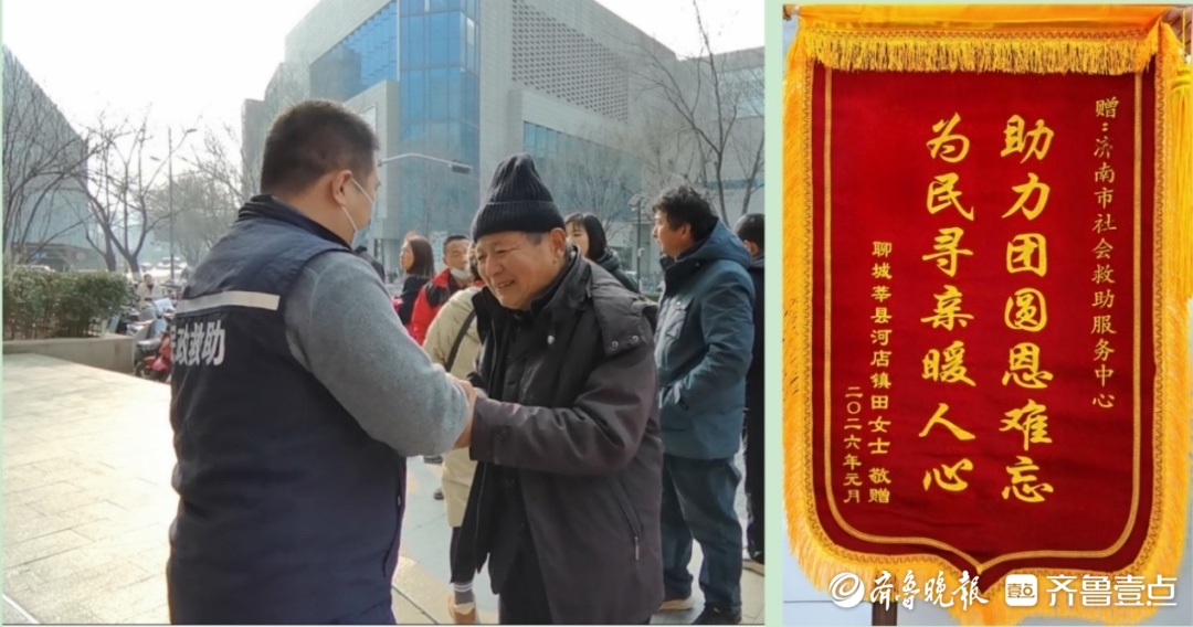 “助力团圆恩难忘,为民寻亲暖人心”。近日,济南市社会救助综合服务中心收到了一面特殊的锦旗,赠予者正是刚刚与失散九年亲人团聚的阿营(化名)的家属。这面锦旗背后,是中心联合多部门开展的“暖途”救助专项行动传来的又一捷报:又一位长期漂泊在外的流浪人员,在救助工作者努力下,与家人重新团聚。