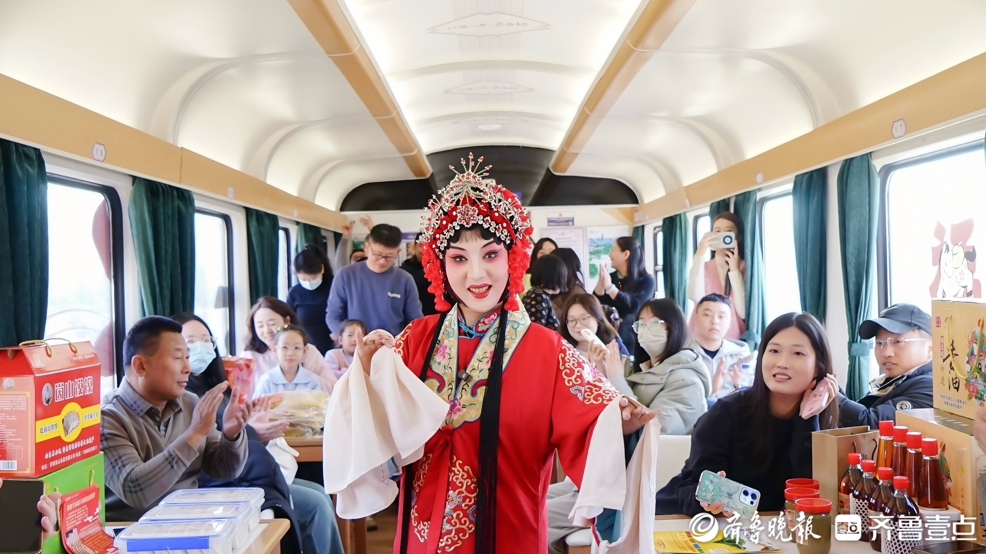 为增添活动文化氛围,特别邀请长清本土山东梆子剧团,在特色美食餐车开展专场展演,演员们高亢激昂的唱腔、韵味十足的表演赢得现场乘客阵阵喝彩。演出间隙,演员还向旅客详细介绍长清非遗传统民俗演艺特色及曲目背景,让乘客在欣赏精彩表演的同时,深入了解长清非遗的独特魅力,推动非物质文化遗产活态传承。