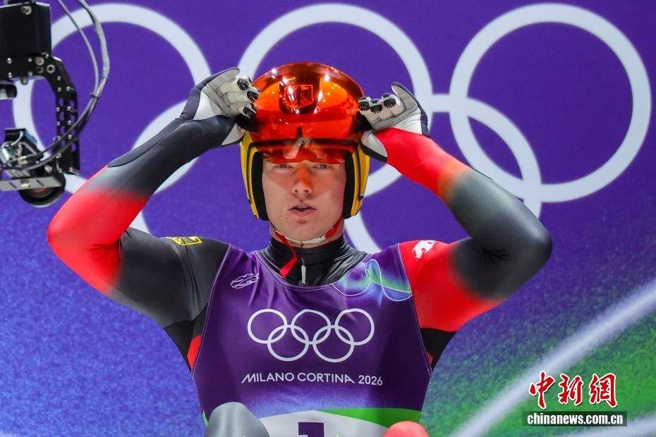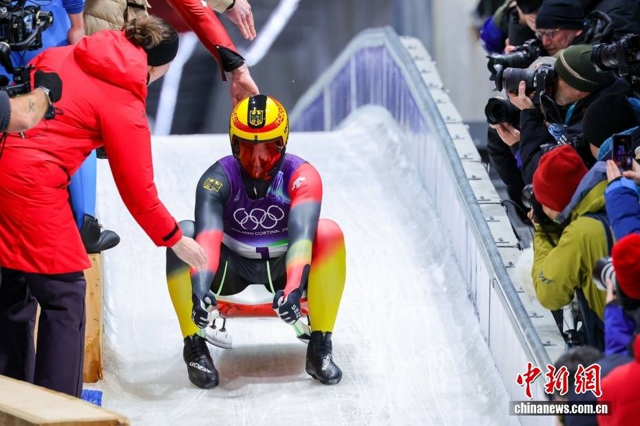 当地时间2月8日晚,2026年米兰-科尔蒂纳冬奥会男子单人雪橇比赛在科尔蒂纳滑行中心收官。德国选手马克斯·朗根汉以四轮滑行总成绩3分31秒191,摘得金牌。图为获得金牌的德国选手马克斯·朗根汉抵达终点。中新社记者 骆云飞 摄