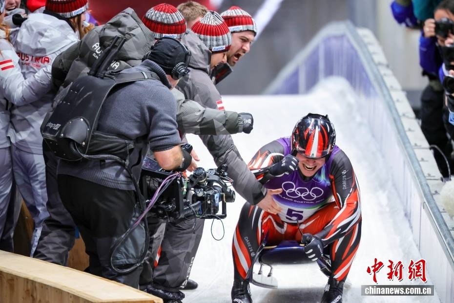 当地时间2月8日晚,2026年米兰-科尔蒂纳冬奥会男子单人雪橇比赛在科尔蒂纳滑行中心收官,德国选手马克斯·朗根汉摘得金牌。图为获得银牌的奥地利选手乔纳斯·米勒在抵达终点后与队友庆祝。中新社记者 骆云飞 摄