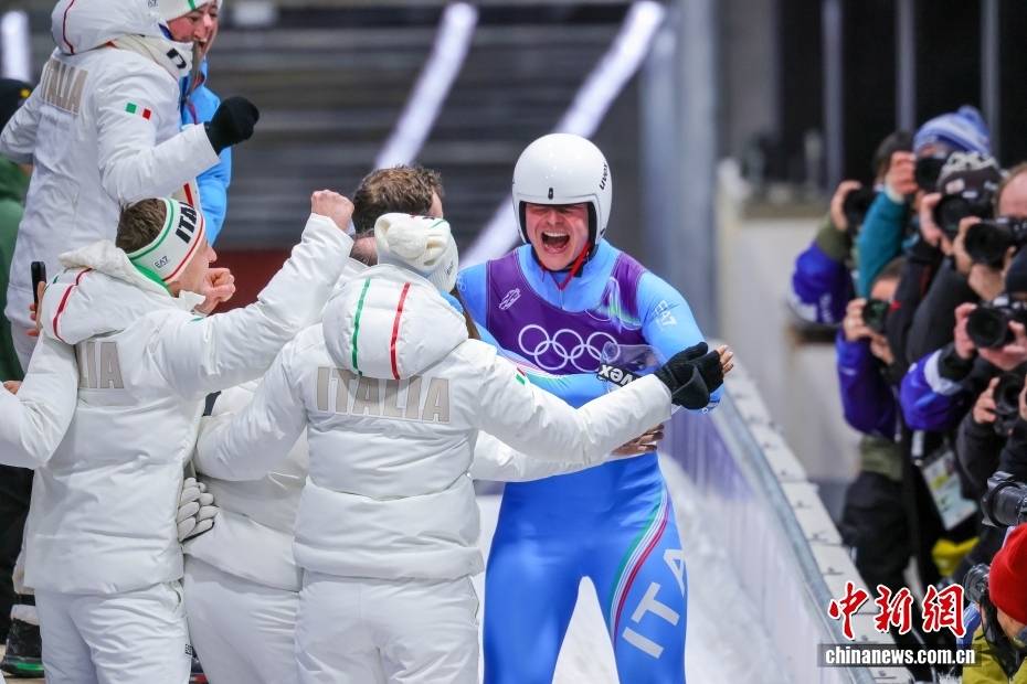 当地时间2月8日晚,2026年米兰-科尔蒂纳冬奥会男子单人雪橇比赛在科尔蒂纳滑行中心收官,德国选手马克斯·朗根汉摘得金牌。图为获得铜牌的意大利选手多米尼克·菲施纳勒在抵达终点后与队友庆祝。中新社记者 骆云飞 摄
