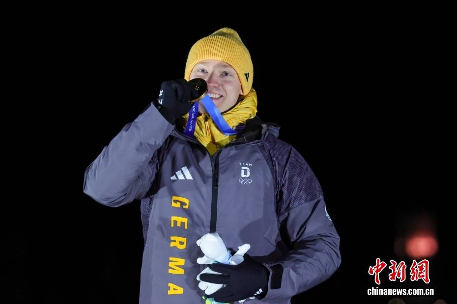 当地时间2月8日晚,2026年米兰-科尔蒂纳冬奥会男子单人雪橇比赛在科尔蒂纳滑行中心收官。德国选手马克斯·朗根汉以四轮滑行总成绩3分31秒191,摘得金牌。图为获得金牌的德国选手马克斯·朗根汉在颁奖仪式上。中新社记者 骆云飞 摄
