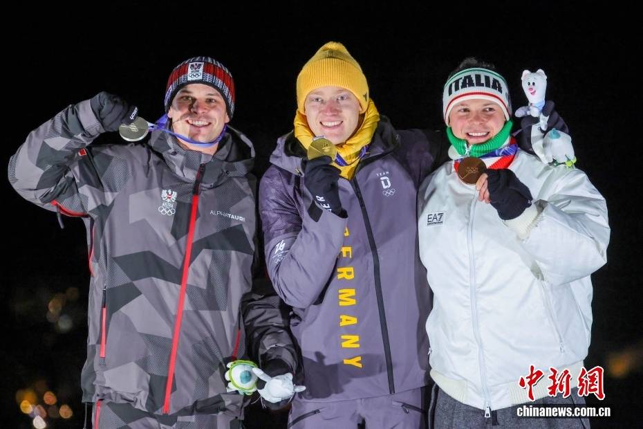当地时间2月8日晚,2026年米兰-科尔蒂纳冬奥会男子单人雪橇比赛在科尔蒂纳滑行中心收官。德国选手马克斯·朗根汉以四轮滑行总成绩3分31秒191,摘得金牌。图为获得金牌的德国选手马克斯·朗根汉(中)、获得银牌的奥地利选手乔纳斯·米勒(左),获得铜牌的意大利选手多米尼克·菲施纳勒在颁奖仪式上。中新社记者 骆云飞 摄