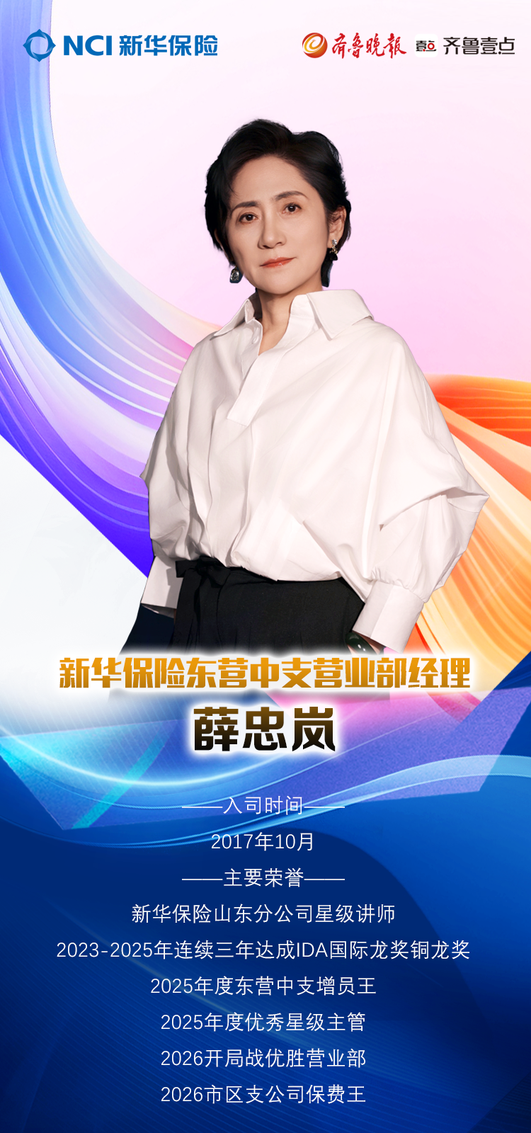 2017年10月,50岁的薛忠岚转行来到了东营新华保险,在此之前,她是当地两家企业的股东,还在一家企业担任主管会计,可以说是一位不折不扣的企业精英。加入新华保险后,她迅速适应、不断学习,很快又成为保险业一颗冉冉升起的新星。