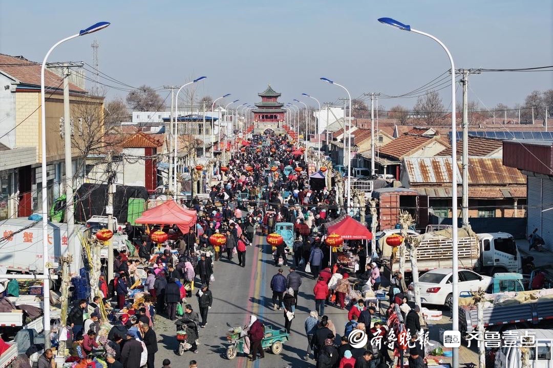 2月9日,农历腊月二十二,正逢淄博市高青县青城大集。临近年关,熙熙攘攘的人群从四面八方涌向青城镇地标建筑文昌阁,带着满满的期待和喜悦来赶青城大集,共赴这场年味盛会。