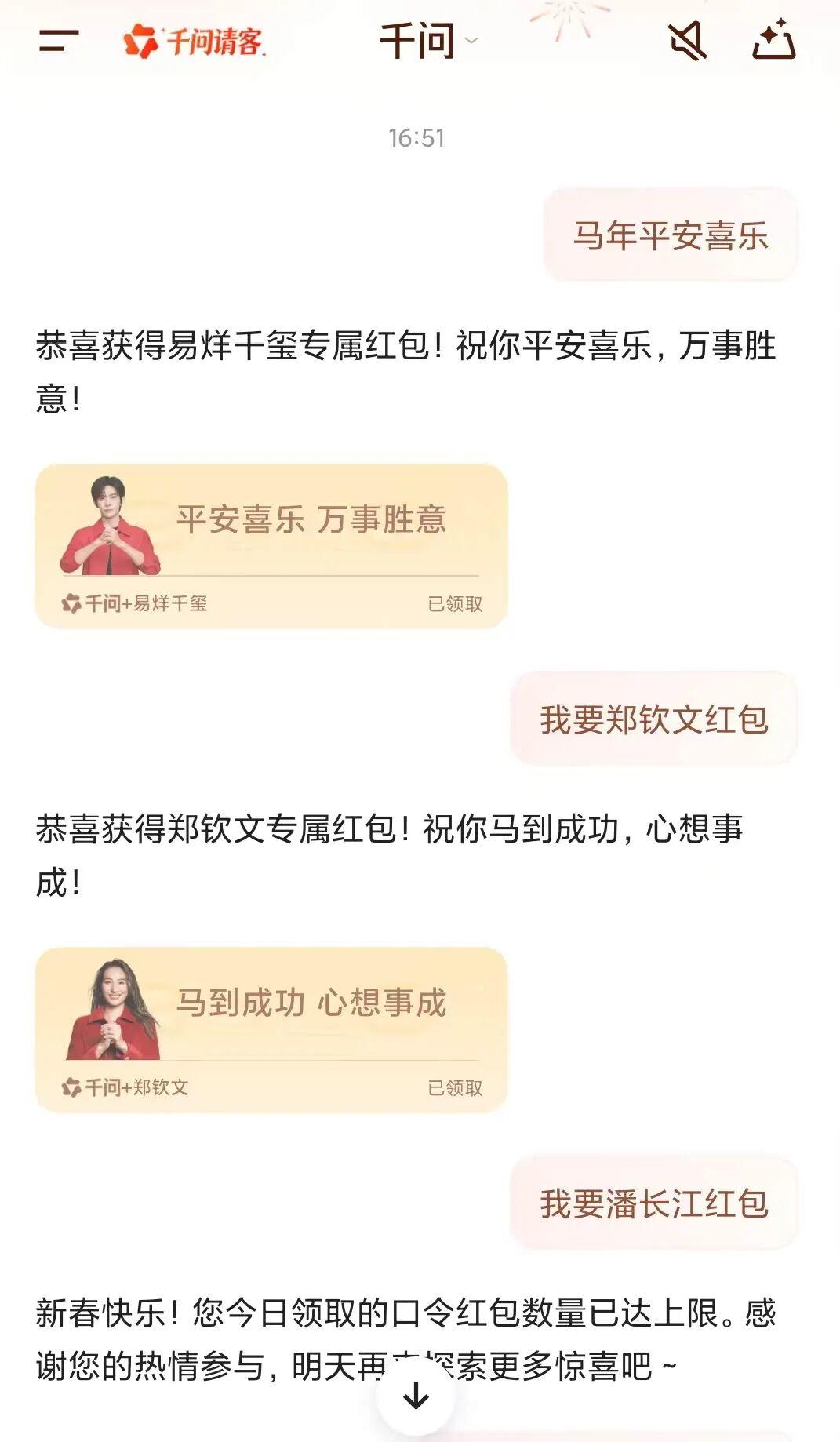 此外,用户发送“马年平安喜乐”“我要郑钦文红包”“我要潘长江红包”等指定口令,也可领取对应专属红包,最高金额同样达2888元,数量有限。