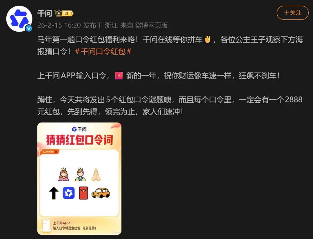 2月15日下午,千问官方宣布发放专属千问口令红包。用户打开千问APP并输入对应口令,即可领取专属红包,且红包可秒到账。此外,千问还将于除夕当晚推出整点红包雨。